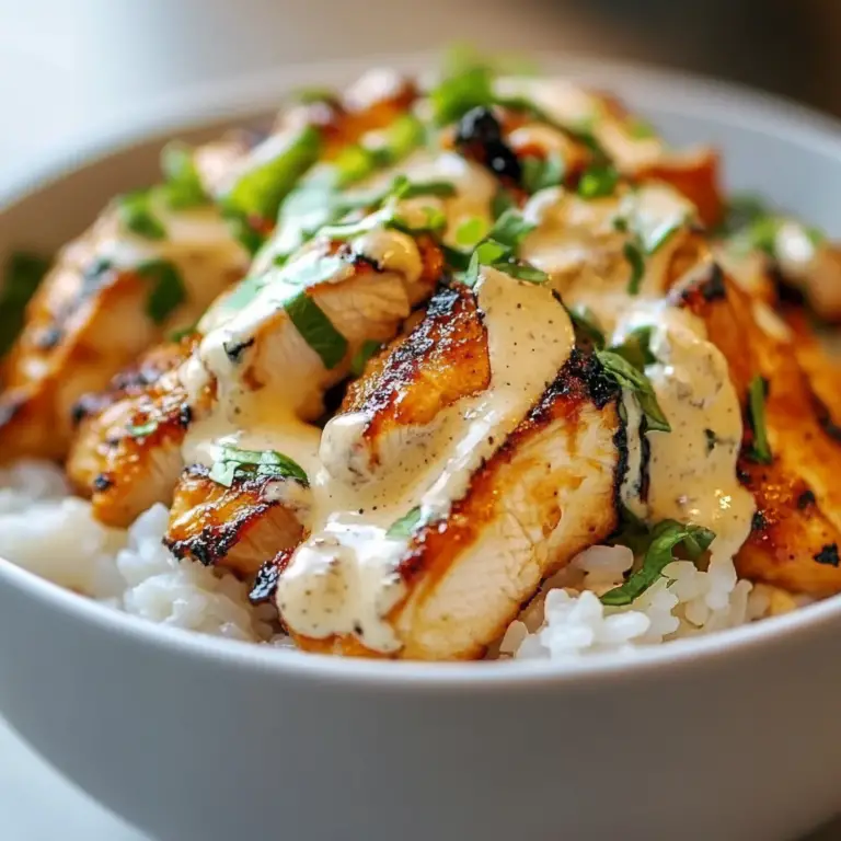 Indulge in these savory chicken and rice bowls drizzled with a rich, creamy garlic sauce that transforms dinner into a delightful experience.