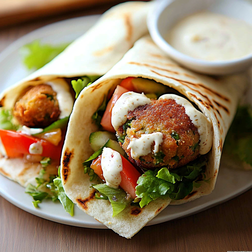 Savor a crispy falafel wrap filled with fresh veggies and drizzled with creamy garlic tahini sauce—ideal for a quick meal or delightful gatherings.