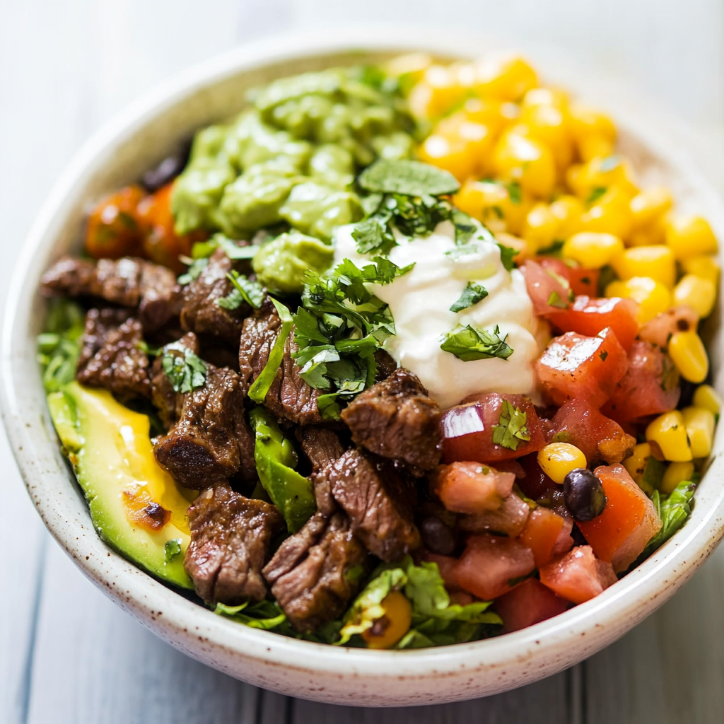 A steak burrito bowl is a delicious combination of seasoned steak, rice, and fresh toppings served in a bowl.
