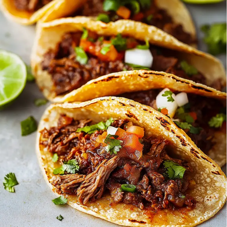 In summary, Beef Birria Tacos offer a delightful fusion of flavors that satisfies any taco craving. This recipe highlights the importance of slow-cooking the beef to achieve tenderness while allowing spices to meld beautifully. By serving these tacos with fresh accompaniments like cilantro and lime wedges, you enhance their appeal even further. Whether enjoyed at home or served at gatherings, these tacos create memorable culinary experiences that will impress family and friends alike. Don’t hesitate to explore variations with different meats or toppings to find your perfect combination!