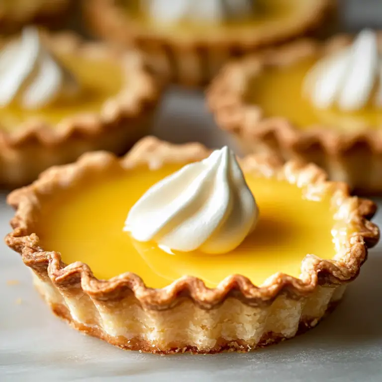 Lemon Curd Tartlets are a delightful fusion of tangy and sweet flavors, perfect for any occasion. These mini desserts feature a buttery crust that crumbles beautifully in your mouth, complemented by a luscious lemon curd filling that bursts with citrus goodness. Ideal for afternoon teas, holiday gatherings, or simply as a refreshing treat, these tartlets are easy to make and sure to impress your guests. Top them with a dollop of whipped cream or fresh berries for an elegant touch that elevates their presentation. Enjoy the sunshine in every bite with these irresistible Lemon Curd Tartlets.