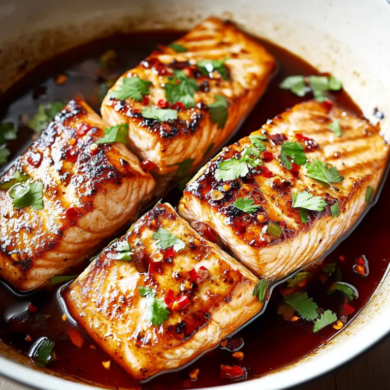 Sweet Chili Salmon is a delightful dish that transforms ordinary salmon fillets into a flavorful masterpiece. This recipe features succulent salmon coated in a homemade sweet chili marinade, creating the perfect blend of sweetness and spice. Ready in under 30 minutes, it’s ideal for busy weeknights or impressing guests at dinner parties. The rich flavor profile, enhanced by fresh lime juice and soy sauce, makes this dish irresistible. Pair it with steamed jasmine rice or sautéed vegetables for a complete meal that’s not only delicious but also packed with health benefits from the omega-3 fatty acids in salmon. Enjoy this vibrant dish that will surely make your taste buds dance!