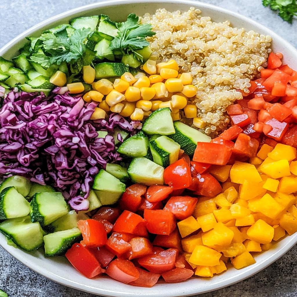 - This vibrant quinoa salad with fresh veggies not only bursts with flavor but also brings a rainbow of colors to your plate